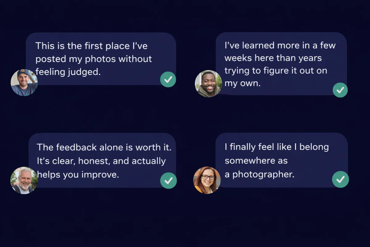 This is for beginner to intermediate photographers (and we have some pros too!) who value respect, humble learning, and genuine connection over competition or perfection.